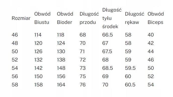 Twój wymiar powinien być mniejszy o 4-6 cm od wartości podanej w tabeli.