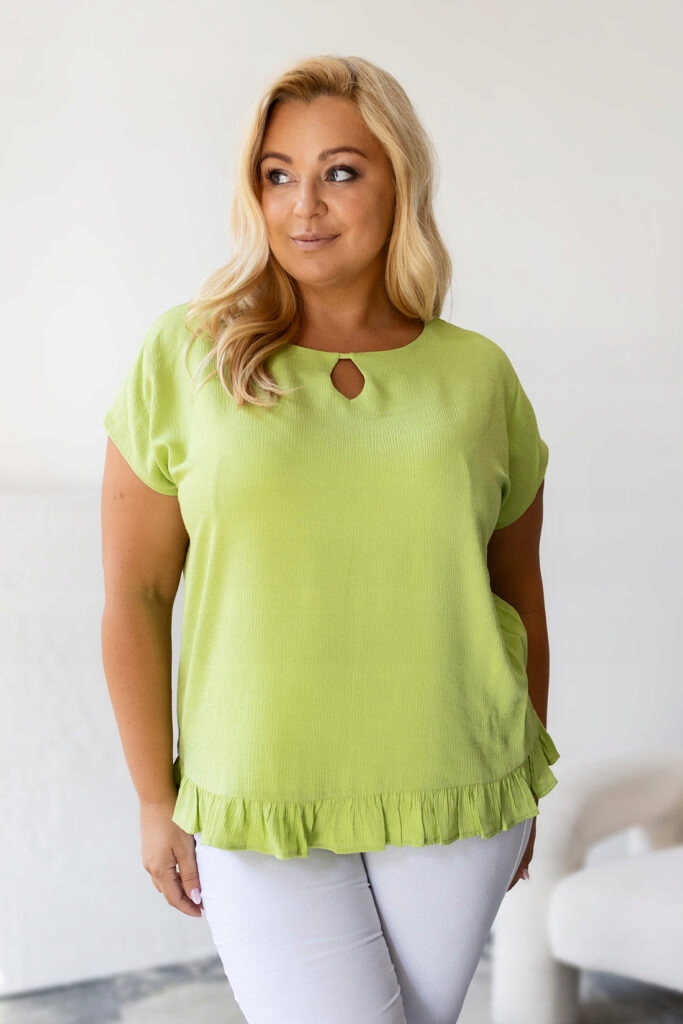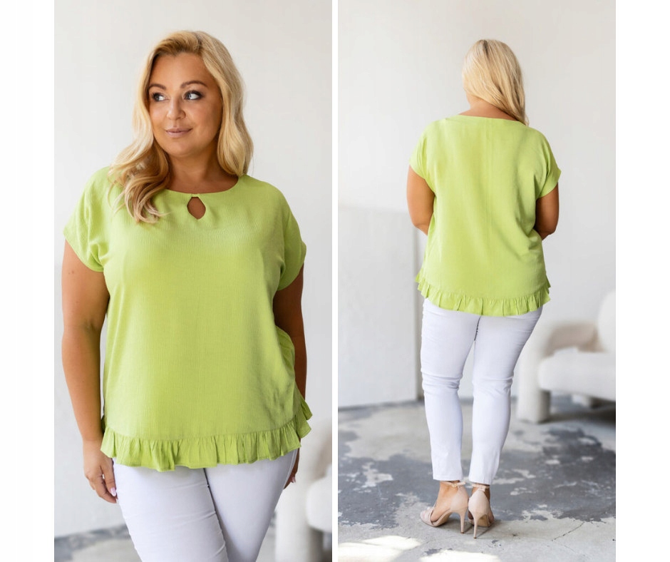 Szukasz bluzki, która połączy klasykę z nowoczesnym stylem? Nasz model o kroju kimono to esencja kobiecości i wygody! Luźny, swobodny fason pięknie układa się na sylwetce, a subtelna falbanka na dole dodaje mu lekkości i uroku.