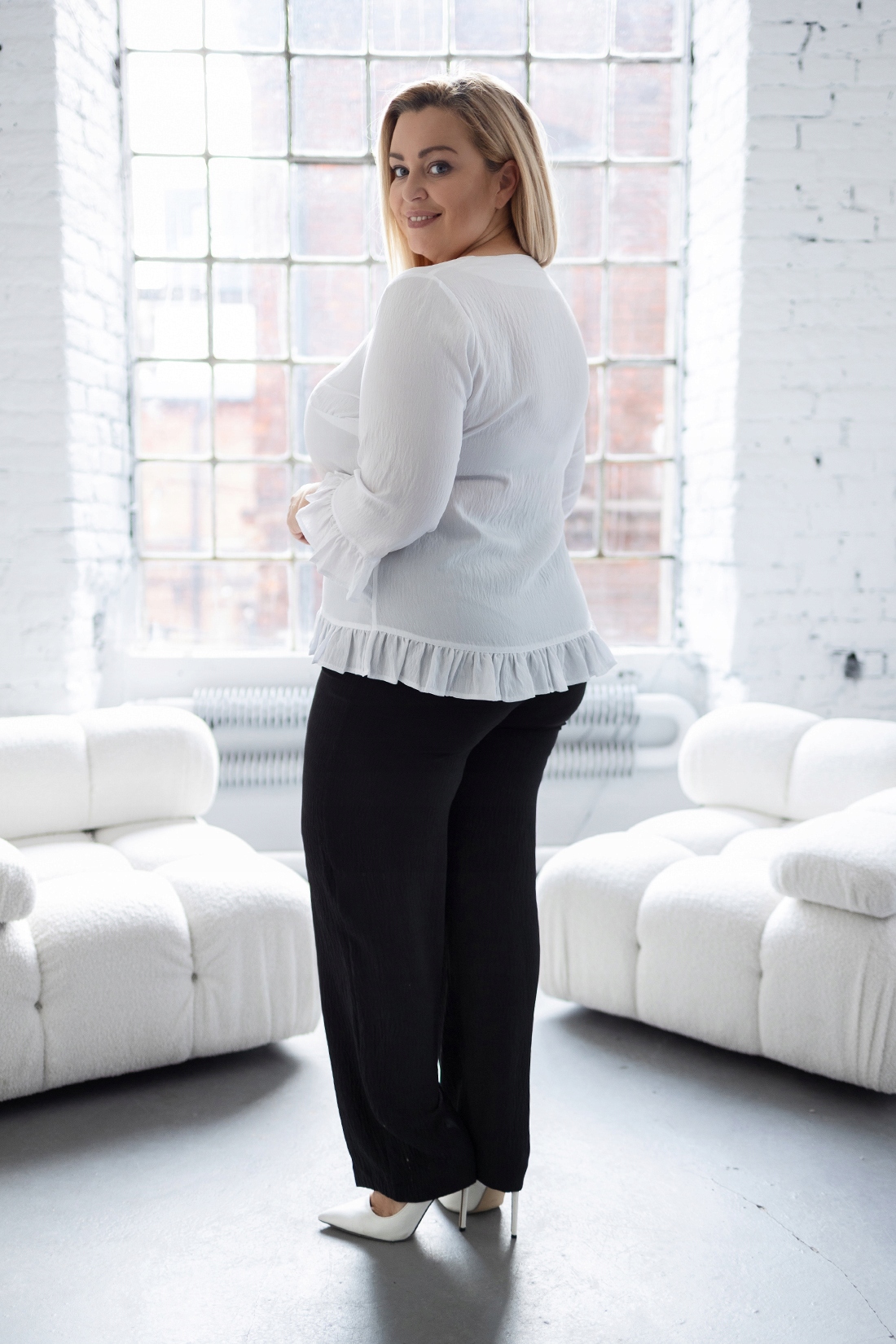 Lekko taliowana tunika uszyta z przewiewnej wiskozy o delikatnie kreszowanej fakturze. Dekolt w serek optycznie wydłuża szyję, a subtelne falbanki przy rękawach i dole nadają całości lekkości oraz romantycznego charakteru. Idealna zarówno do codziennych, jak i eleganckich zestawień.