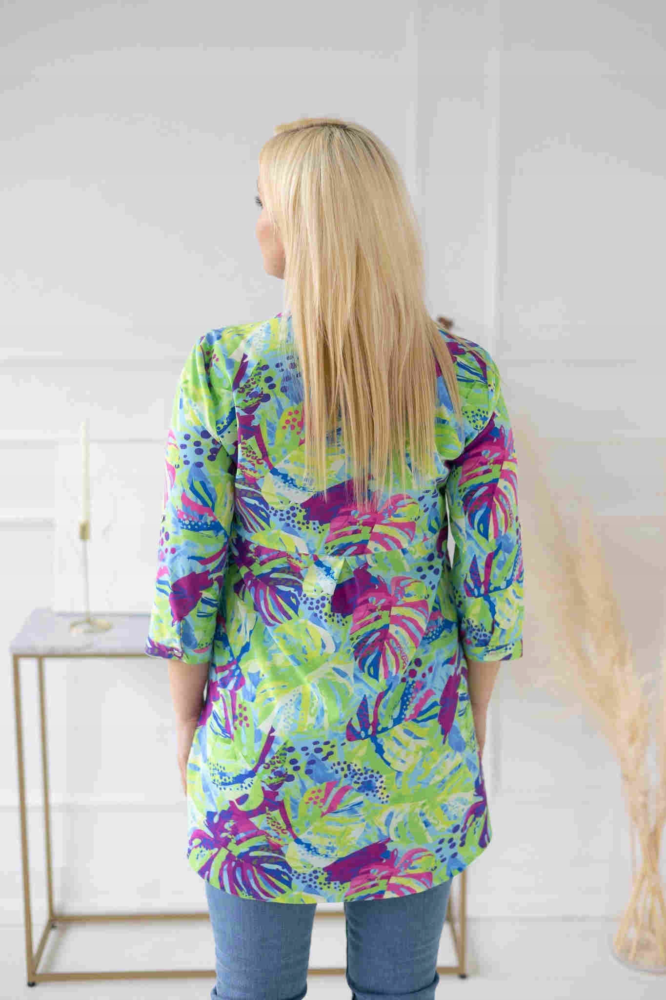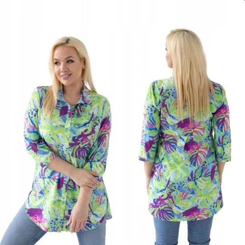 Długa elegancka koszula SANDRA wzór rododendron seledyn rozmiar 46