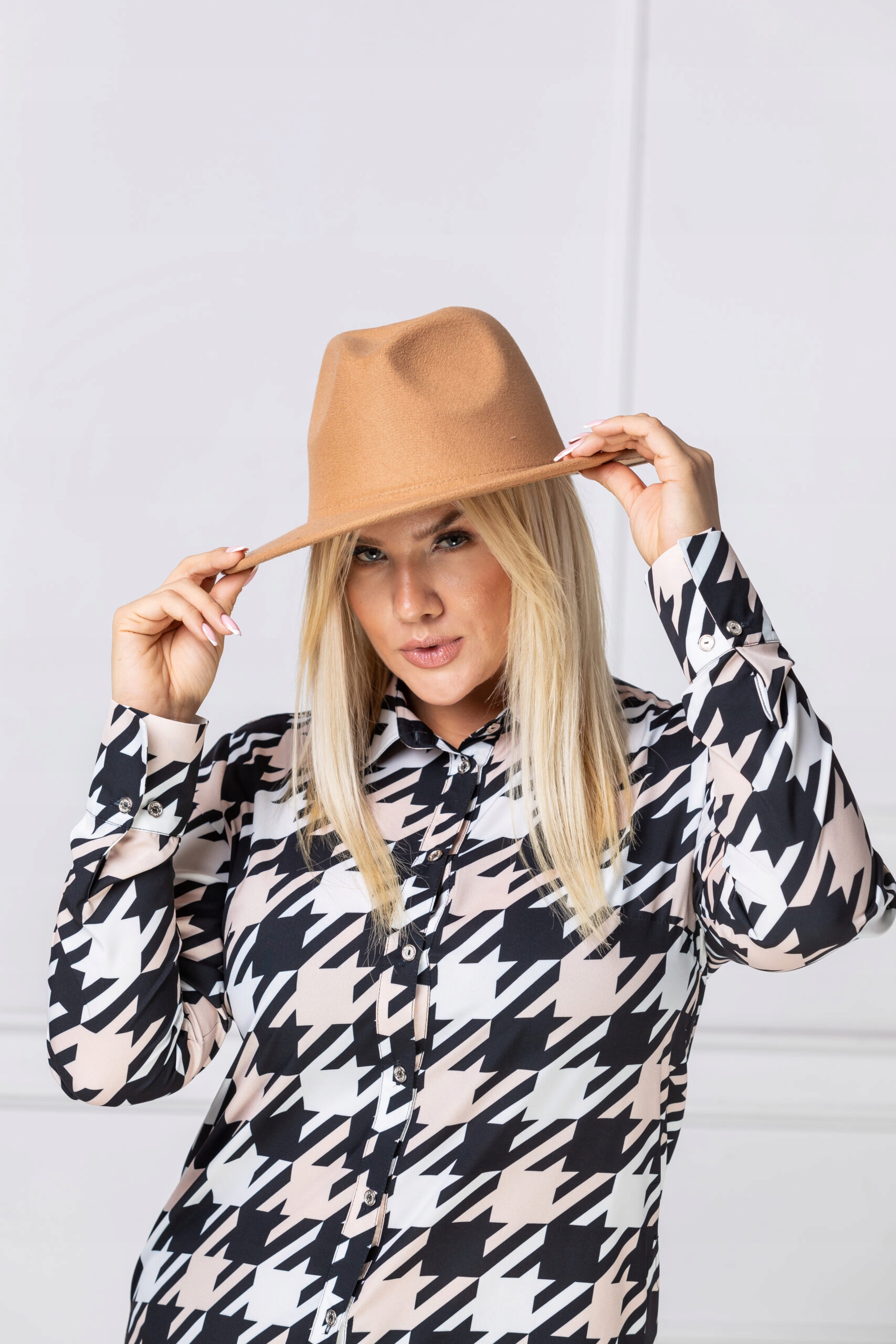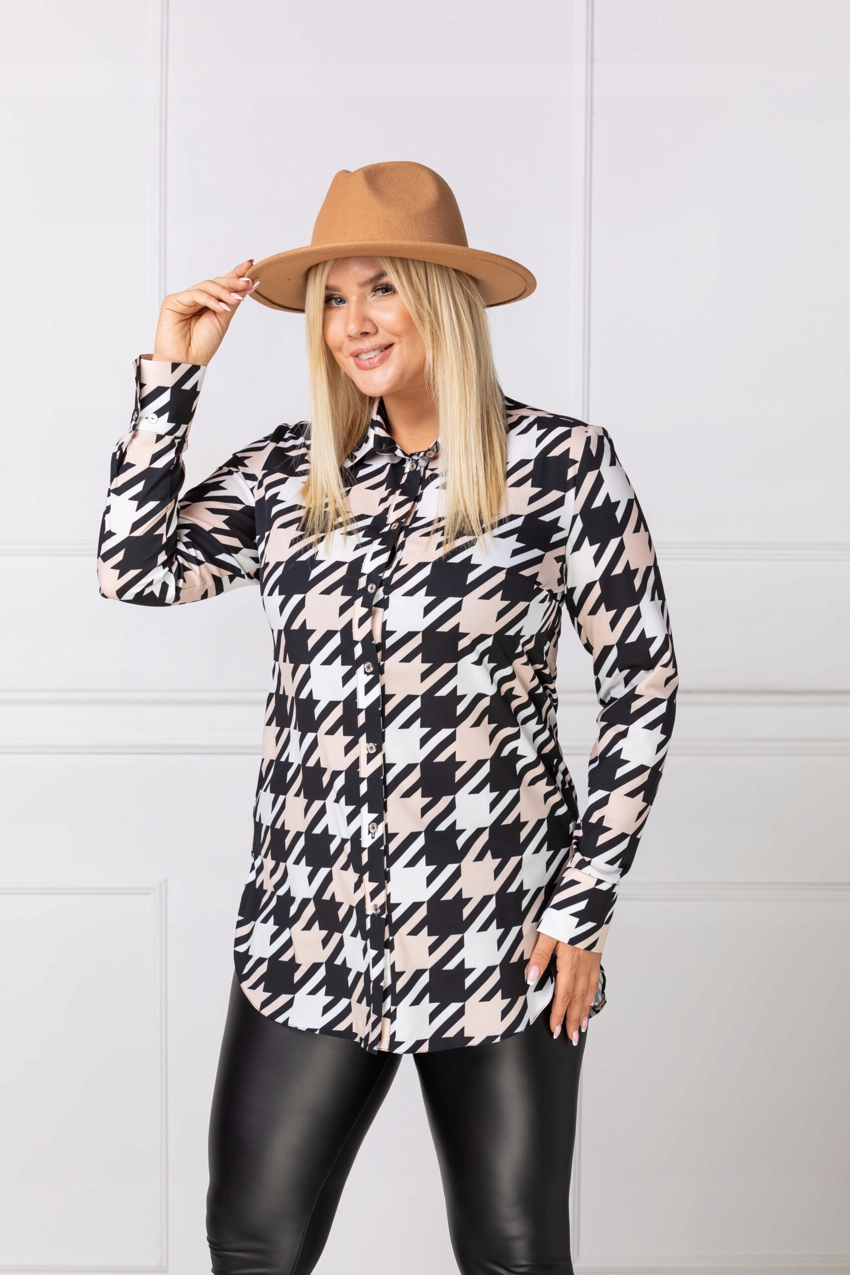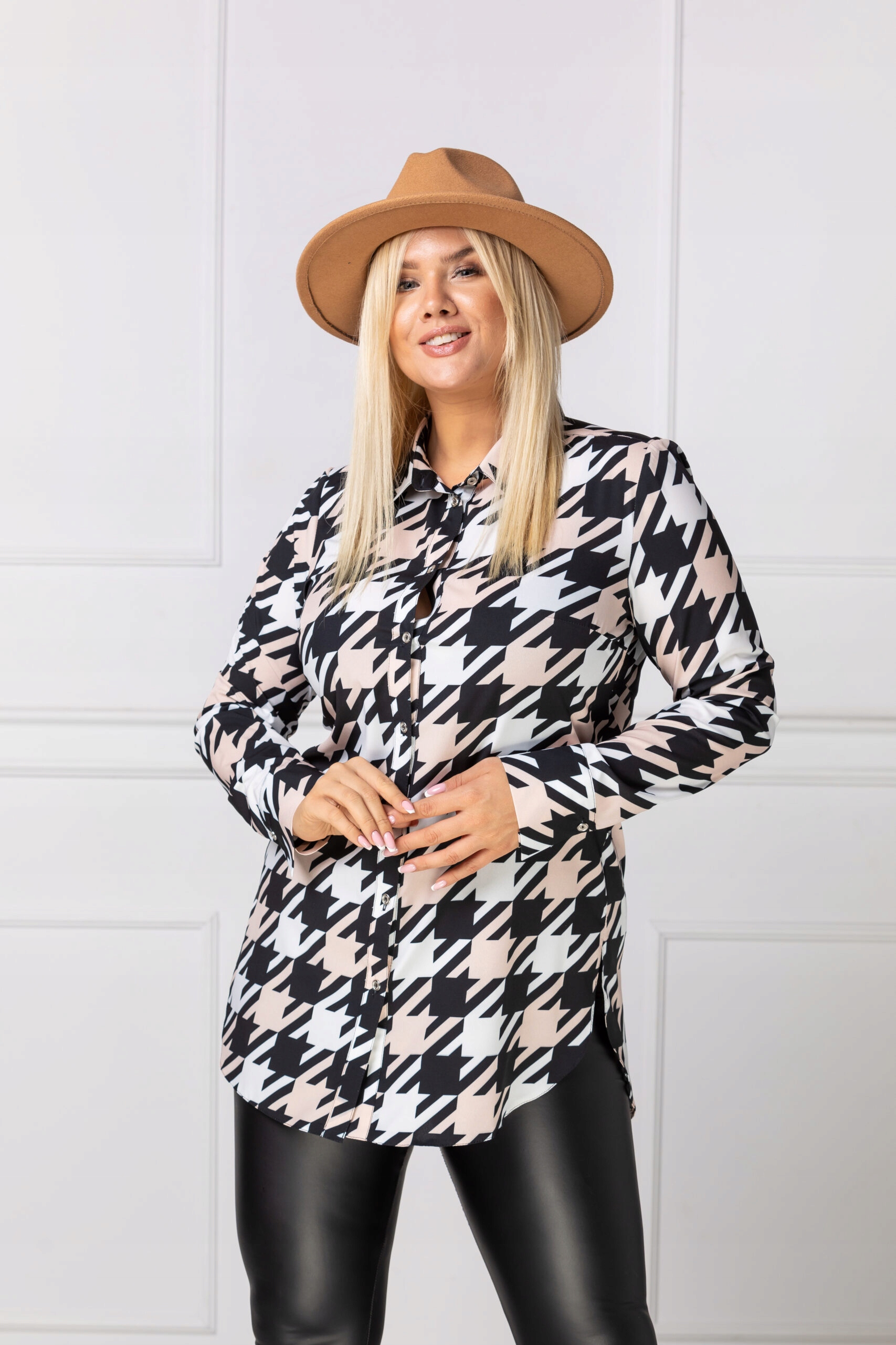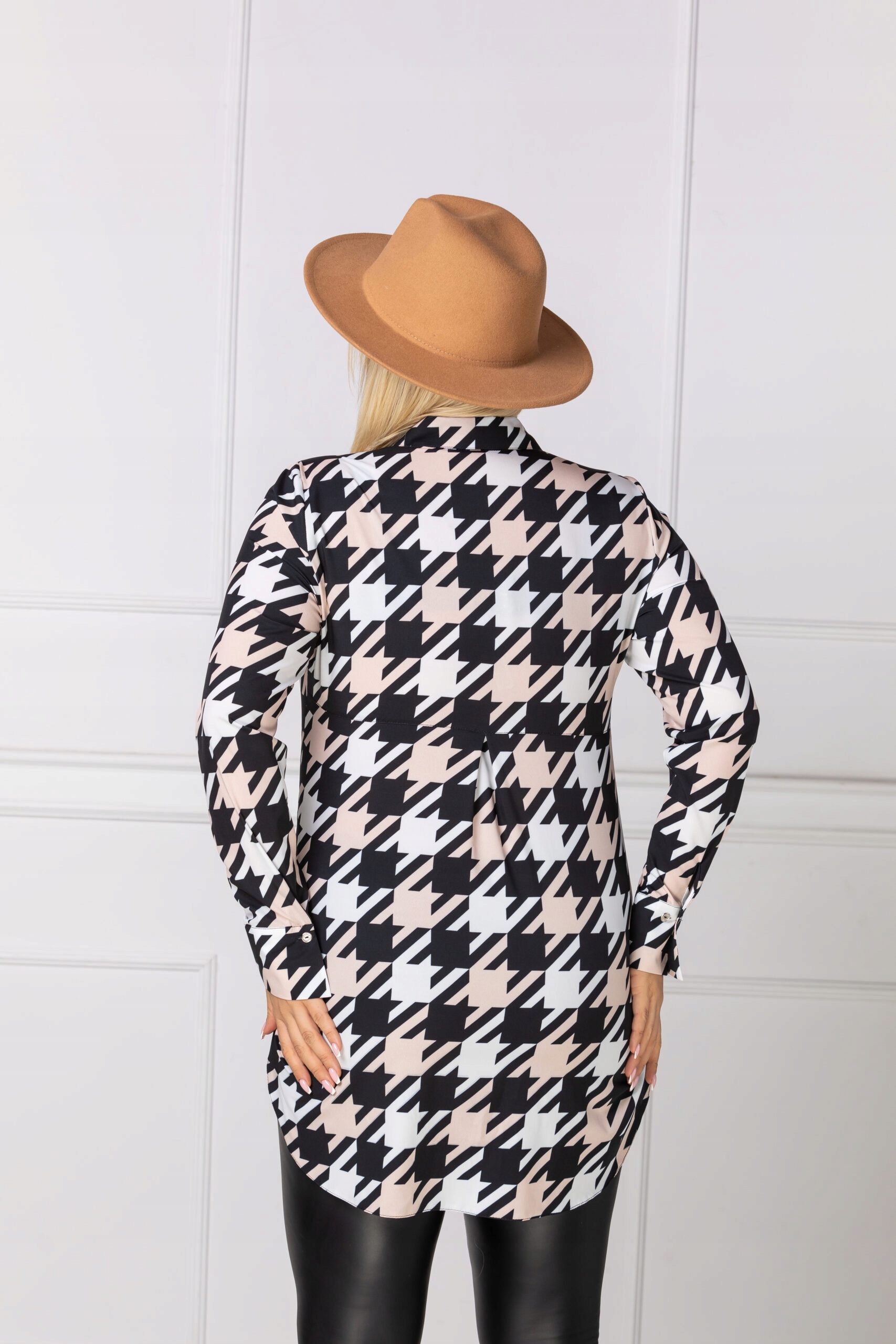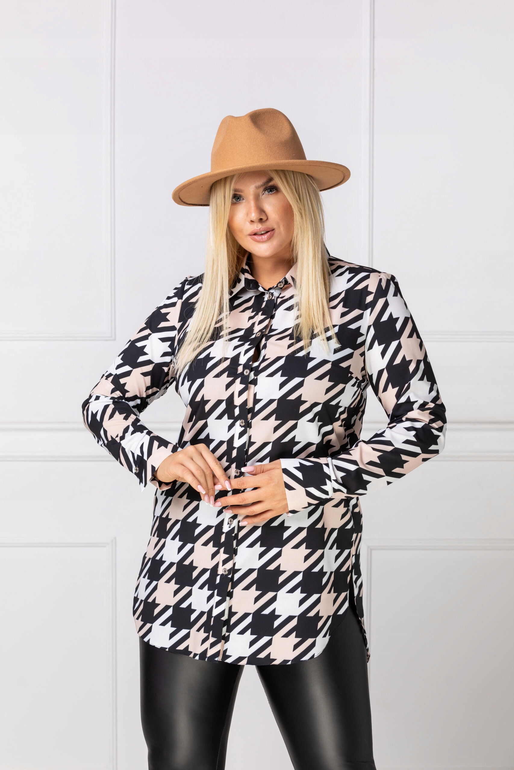 Długa elegancka koszula wzór kontrastowy białoczarny.