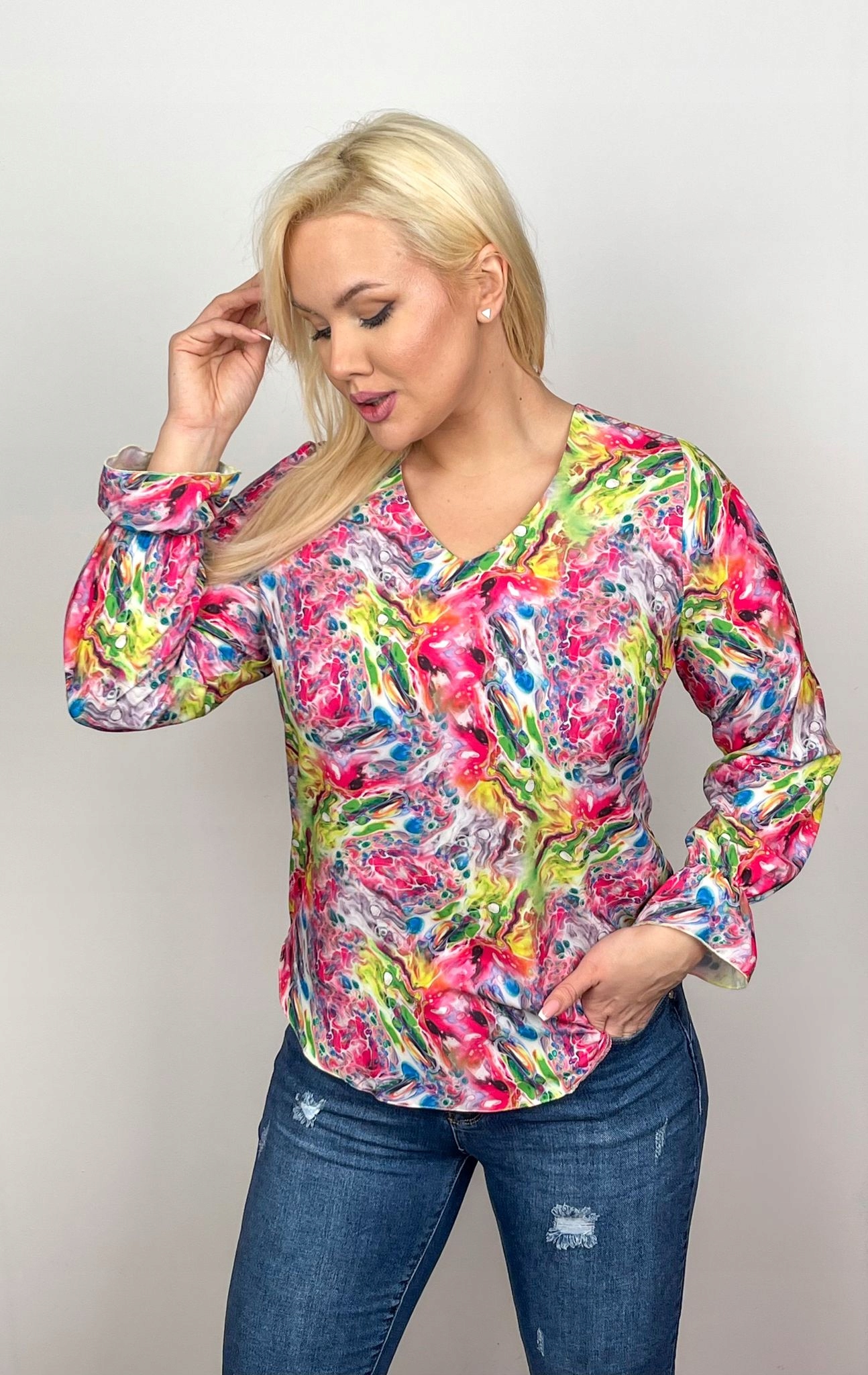 Bluzka we wzór z dekoltem w serek eksponującym długa szyję.