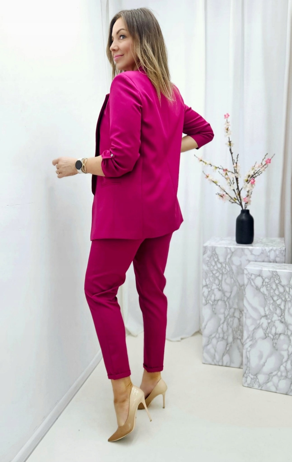 Żakiet i spodnie pochodzą z tej samej partii materiału, dlatego nie występują różnice w odcieniach kolorystycznych między elementami zestawu.
