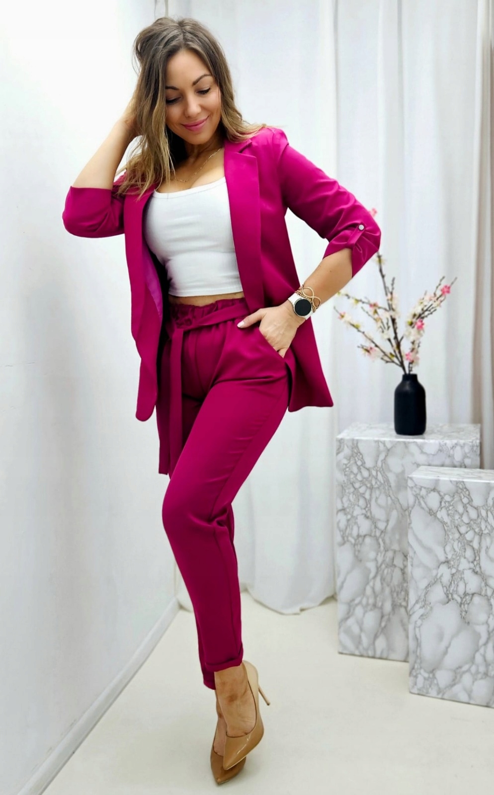 Żakiet tworzy zestaw ze spodniami w talii typu paper bag.