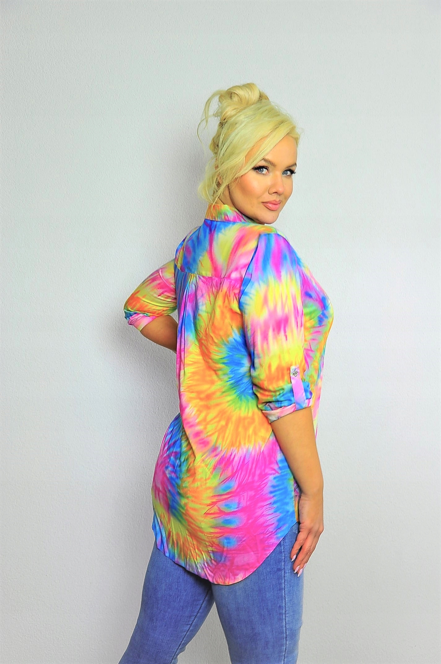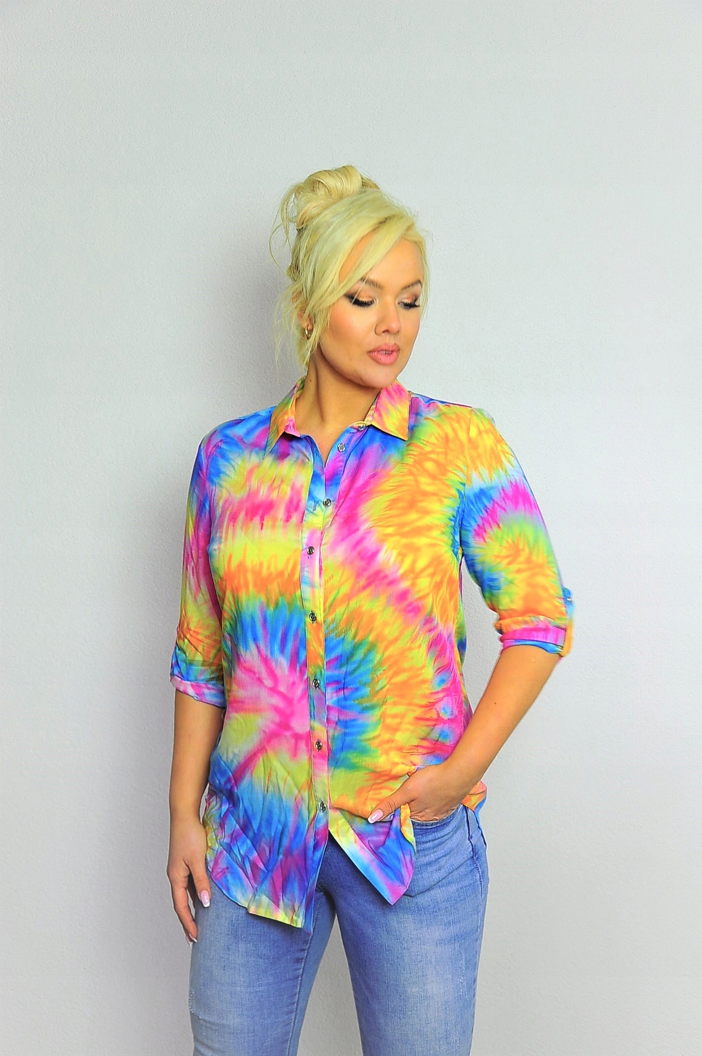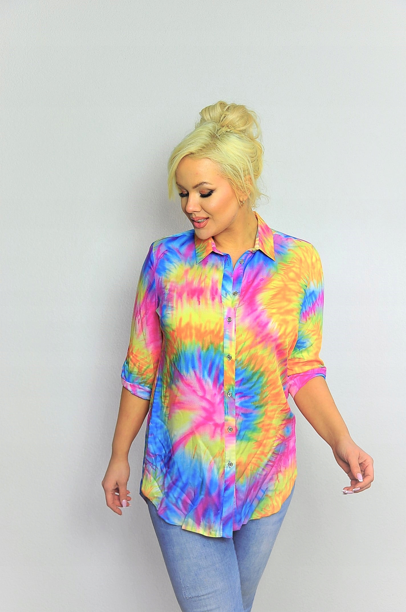 Koszula o przedłużanym fasonie w kolorowy print.
