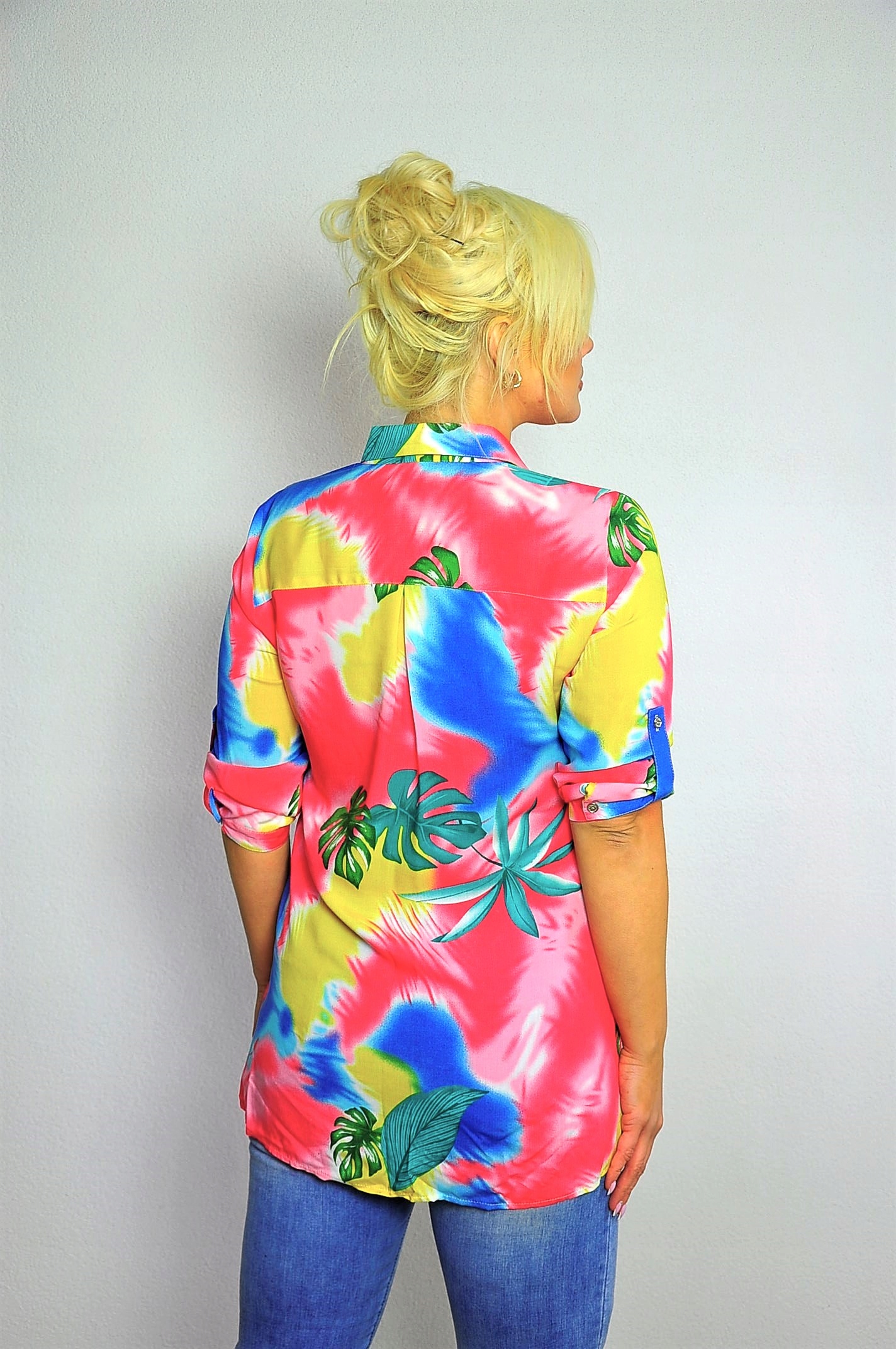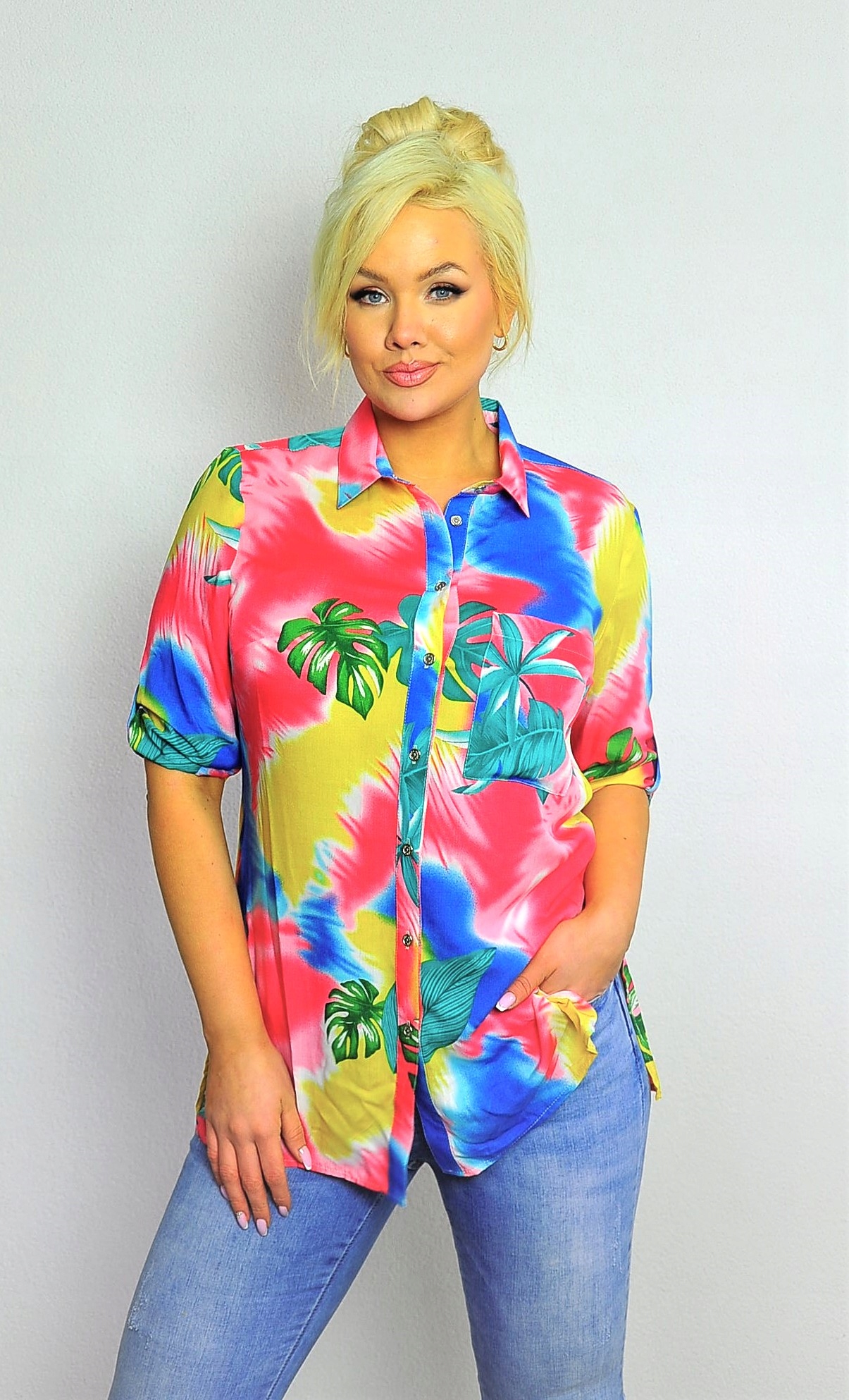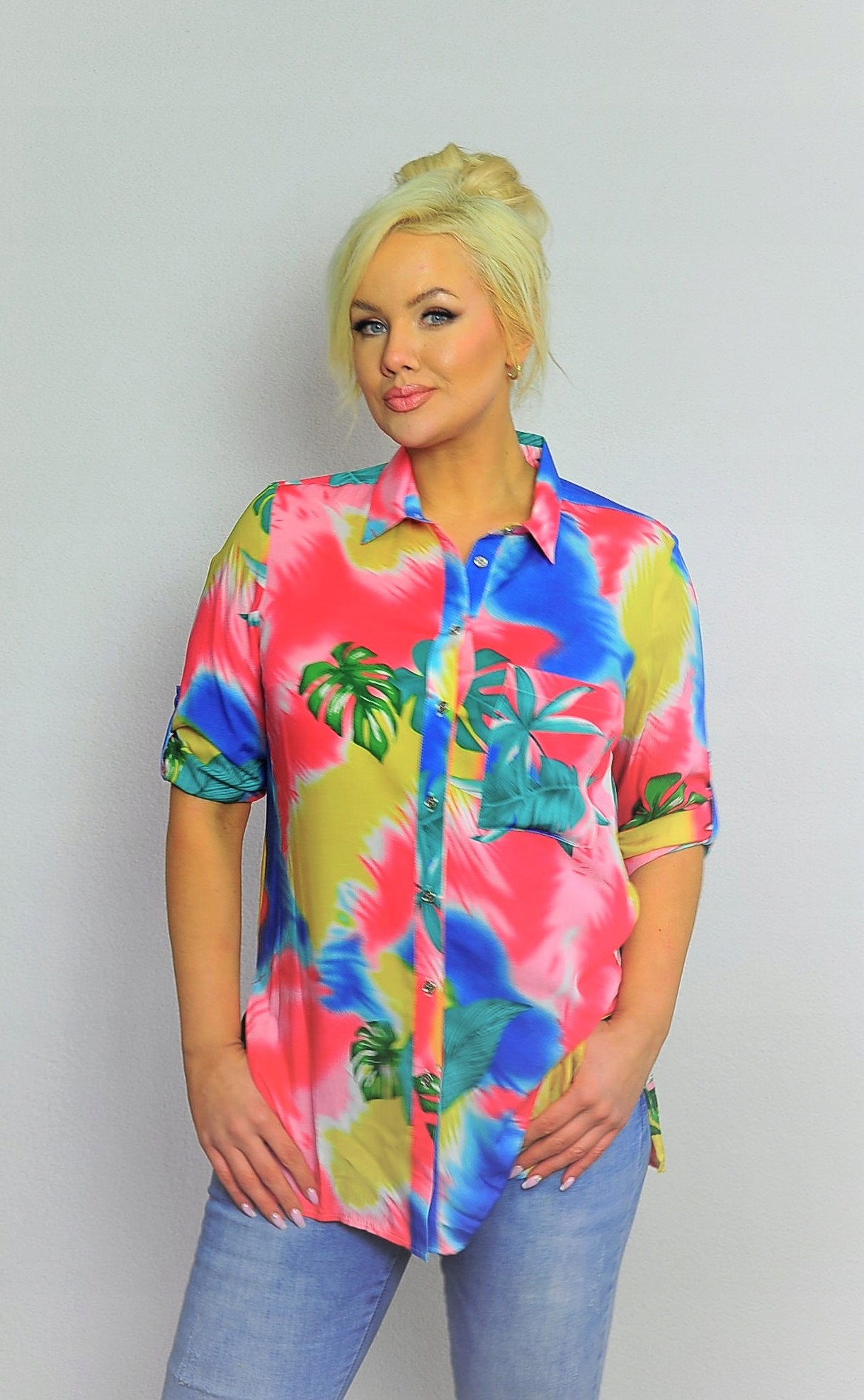 Koszula o przedłużanym fasonie w kolorowy print.