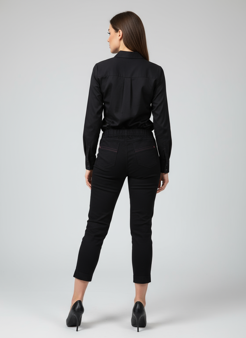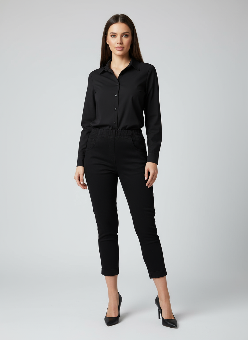 Spodnie długość 7/8 z czarnego jeansu bez osnowy jasnej, zwężana nogawka.