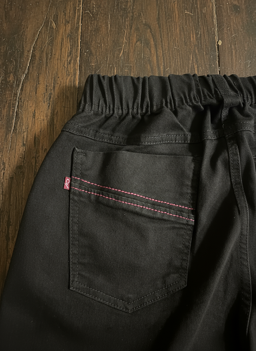 Wysoki stan, w pasie guma, z przodu i z tyłu kieszenie.