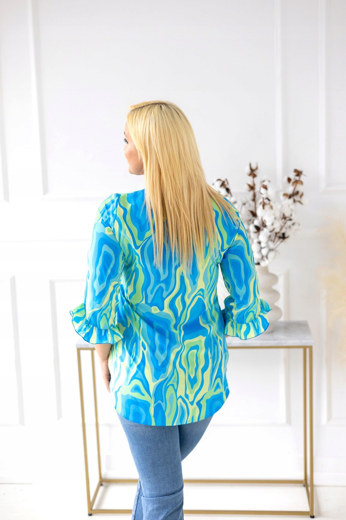 - rękaw 3/4 za łokieć zakończony finezyjną falbanką